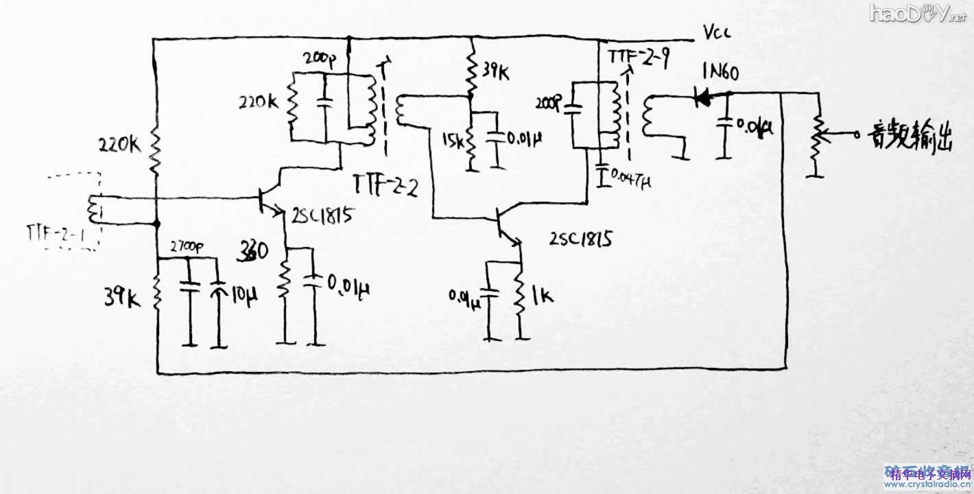 小时候就想做收音机,可惜处在小地方,没那个条件。虽然后来买过套件来圆那个梦,竟然没有装响!这几年DIY积攒了不少元件,工具也逐渐齐备了,理论知识也比以前明白了很多,自己设计制作一个应该不难吧! 不可缺少的磁棒、可变电容、中周都从网上买到了,再参考一些老收音机的电路图,以及学习了日本人写的收音机电路设计与制作的书,也就有了大体的设计。管子用2SC1815这个常用的东西看看,检波用1N60,音频放大用TDA2822搞定来得简单。电路参数结合实际实验来确定。最后算是试验成功了,虽然还有点小问题……