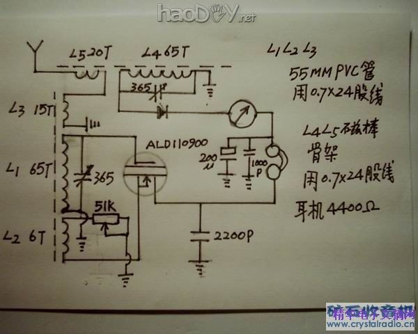 经过一个月的多次试验,终于对 ALD110900 应用有所突破。 这种 MOSFET 用电很省,小电流低电压便可工作。因此,利用它这个优点,用普通矿石机捡波后的电流向它供电,由 L2 作反馈产生再生。实验中矿石机产生的电压是 0.2 V,电流约 50 μΑ,已经能够很好地工作。 在我的实验中,天线只用电话四芯线多余的二条。地线是接在打入墙的一个钉子上,倘若地线接煤气管道,效果将会更好。 整机装配如图。为了不产生牵制,矿石机和再生机二条磁棒垂直安装。为了提高接收能力,加大 L1 和 L2 的直径,L3 是在磁棒骨架上绕 15 圈,两部机的两个天线线圈 L5 和 L3 串联,形成一付天地线共用。用 51K 电位器控制再生。 电流表是指示矿石机调准的。使用时先调矿石机部分,收本地台调整可变电容器到电流表指示最大。然后转动 ALD110900 接收部分的可变电容器,很多地方都有再生啸叫声。选一个声音大一点但不是本地作电源的电台,慢慢调整再生电位器,使声音最大最好。 如有条件可用选择过的普通绝缘双栅 FET 代替 ALD110900 实验,但效果差一些。附近没有本地强台的坛友,可以用 1.5 V 电池代替矿石机作试验。 这台实验机的缺点是再生控制不太平滑,有些失真。不过这只是初步实验,希望大家一起来研究改进! 整机接收效果优于一般单管再生机,各电台绝无串台。在海口市可收到广东、江西、越南等地的电台。 这只是初步调试,下一步将试验把 ALD110900 的两个 MOSFET 分开,一个做再生检波,另一个做音频放大,希望效果更好。