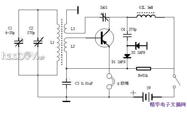这个单管机用耳机收听本地电台声音可以震耳,白天本地的7家电台都可以收到,晚上可以收到12个电台,至少有一个台是四川的,因为听到卖大力药丸的说“热线电话028xxx”,呵呵!估计灵敏度在3~5mV/M之间,接近于只有一级中放的简易外差机。这里说明一下虽然两者灵敏度都在3~5mV/M之间,但是一个用耳机一个用喇叭收听,实质是不同的。 单管机对于无线电爱好者来说具有划时代的意义,它和矿石机比较虽然都用耳机收听,但却甩掉了外接天线这根辫子,同电子管单灯机比较只要2节5号电池就可以工作,而电子管单灯机则要1.5v的甲电和至少是22.5v的乙电,恐怕还要拖个辫子。那时谁要是装了一部不要天线而且可以放在口袋里随身携带的收音机是很光彩的,用最低成本达到这个要求的就是晶体管单管收音机了。上次装单管机还是三十几年以前的事情了,此次重新装机又有不少体会。 二、讨论篇 单管机装好了,兴趣却不减,索性又找了一块面包板,把常见的单管机电路全部搭了一遍,这些电路在经典晶体管收音机老书里都介绍过,这一个是一些电路以前我也没有试验过,这次作个讨论比较。再一个也是给一些初学的朋友探个路。为了保证可比性,各个电路均用同一只管子,除非电路要求型号不同。实验所用磁性天线长170mm,配用260pF空气可变电容器,试验时均不外接天线,用青年牌2000欧姆双筒高阻耳机 1 、一级低放单管机,这个是由矿石机向单管来复机过度的一个电路 图2-1 实验结果:不外接天线只可以收到本地2家最强电台的播音,声音很轻,必须加一个外接天线才有良好效果 2、再生式单管机,和图1很象,但用高频管加了再生,高频扼流圈不可省 图2-2 实验结果:灵敏度比上图有很大提高,不外接天线可以收到本地全部电台的播音,但再生很不均匀,再生的强弱对收音成绩影响很大,仅当对每一个电台调好再生时这个台的声音才比较响亮,整体效果差强人意。 3 、用8欧姆低阻耳机的单管机 这个电路出现的时间较晚,也不是以前经典的书籍中出现的,所以我以前也没有试验过,这次一起试验了 图2-3 实验结果:两个字:不响!集中注意力仔细辨别,可以隐约听到声音,但无法听清内容。试着把低阻耳机接在集电极回路中,这时的声音都比图中大。这估计是原书作者根据理论画出的原理图,根本没有实践过,想当然地认为把耳机接在发射极回路成为射极输出器就可以带低阻负载了,殊不知射极输出没有电压放大作用,检波后的低频信号本来就微弱,高频管的射随器输出阻抗又不能很好地和8欧姆耳机匹配,效果怎么能好呢?这完全是个纸上谈兵的图纸。 4 、用硅管的来复再生式单管机,线路与典型电路图纸相同,图号命名为图2-4以便下面讨论 。 用9015可以直接代替3AG1,但要把D2换成硅二极管,用9013时除了D1要换成硅二极管外所有有极性的元件(包括电池)要全部反向,下面是常见的90系列晶体管参数表 型号 Pcm(mW) fT 用途 9011 NPN 400 150 高放 9012 PNP 625 150 功放 9013 NPN 625 140 功放 9014 NPN 450 80 低放 9015 PNP 450 80 低放 9016 NPN 400 500 超高频 9018 NPN 400 500 超高频 8050 NPN 1000 100 功放 8550 PNP 1000 100 功放 90系列晶体管放大倍数很大,实验用的这只9015高达335 (责任编辑:admin) |