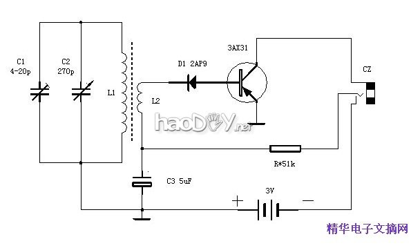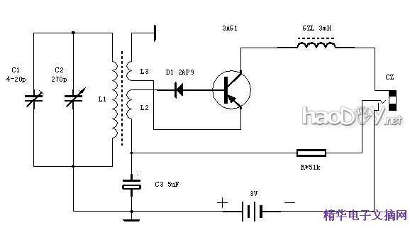 然后按照原理图照图施工,并不复杂,焊接完毕检查一下有无接错漏焊的地方,确认正确后即可调试。 调试 (调试前首先确认有电台在广播)把R*的位置用一只100k电位器串一只30k 的固定电阻代替,电位器转至阻值最大处,再生线圈L3先不套进磁棒。确认接线无误后接上耳机、电池,再从大往小调整电位器,到某处听到耳机中有明显的“沙沙”声时停下,调节单连就可以收到播音。再调整电位器使信号清楚响亮。测量一下晶体管的集电极电流(也可以先把万用表串在电路中)在0.5~2mA之间都有可能,通常电流大声音大,电流小灵敏度高。 再把再生线圈L3套进磁棒,调节和L1的位置,使波段高端刚好不啸叫。如果不起再生把L3的两个线头对调。移动高扼圈的位置,使波段低端刚好不啸叫。 固定好高扼圈,把R*用一只相同阻值的固定电阻焊上,把整个线路板装入机壳,盖上后盖,插上耳机通电试机,没有问题就OK!一部小巧精致、怀旧韵味浓厚的单晶体管收音机就制好了,你可以尽情欣赏、享受自己的劳动成果了!