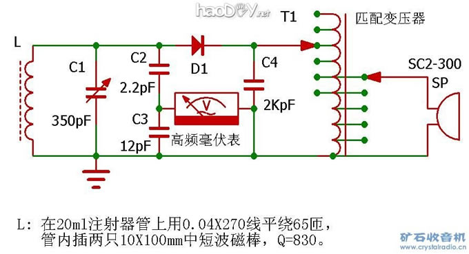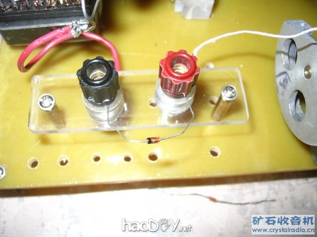 | 众所周知,矿机的调谐回路在不接入任何负载时的Q值就是空载Q值,而一旦接入检波级后,调谐回路便会因检波级输入阻抗的影响Q值而下降很多,这个下降了以后的Q值就是有载Q值。 在一般的矿机里如果我们不采取任何措施,由于检波级输入阻抗对调谐回路的影响,有载Q值一般只有十几到几十。如果花费更大的代价而使用Q值更高的线圈和可变电容,虽然可以使有载Q值提高一些,但是提高的程度却是很有限的,通过这种方式能让那个有载Q值提高几十已经是很不容易了。矿机调谐回路的有载Q值提高所带来的好处是众所周知的,这种提高的结果就是矿机选择性的提高和灵敏度的提高。由于矿机检波级的输入阻抗是与调谐回路直接并联的,因此检波级的输入阻抗的高低将直接影响着调谐回路的有载Q值的高低。 为了降低检波级输入阻抗对于调谐回路有载Q值的影响,传统的矿机采取了很多的办法,例如将检波级接到调谐线圈的抽头上,这样虽然检波器的输入阻抗没有变大,但是检波器对于调谐回路Q值的影响减小了。采用75号电路或是提高检波器的负载阻抗用以提高检波级的输入阻抗,从而减小对调谐回路的影响,实践证明这些办法行之有效。 很长时间以来本坛的几位矿友一直在孜孜不倦的探索提高检波级负载的途径。梁兄、YJ9386、qg2007和tnlby几位矿友在研制特高阻耳机、绕制超高阻的匹配变压器等方面做了大量的工作,并且不断地取得了新的进展,成绩喜人。我自己也在改造特高阻耳机和超高阻变压器方面做了一些探索和尝试,感觉颇有收获。 今年年初以来我一直有一想法,就是通过实验实际摸索一下如何较大幅度地提高矿机调谐回路的有载Q值的方法。经过近一年的准备,大约从上个月开始利用部分周末时间做了一些探索性的实验,到昨天为止实验基本做完了,下面是我记录实验的一些具体情况,贴上供有兴趣的网友共同探讨。 实验的主要思路: 我们都知道矿机检波级输出的信号含有三种不同的频率成分:音频信号、残余的高频信号和直流成分,检波级的负载对于这三种频率成分所形成的阻抗是不一样的,又由于只有音频信号是最终对声音形成有贡献的信号,所以矿机对这三种频率成分处理的方法也不同。我们还知道这样一个事实:矿机检波级的负载对于调谐回路的有载Q值有着严重的影响,那么到底检波后这3种不同频率成份的负载对调谐回路有载Q值影响是否都一样还是不一样呢?如果是不一样,我们肯定非常关心到底是哪种频率成分的负载对调谐回路有载Q值影响最大,如果我们能够搞清楚这一问题,我们也就可以有针对性的进一步去想办法减小这种影响并提高矿机的性能。另外,除了这三种不同频率成分的负载,是不是还有其他的因素也对有载Q值形成较大的影响,这也是我们非常关心的,为此做了如下的一系列的实验: 实验平台的准备以及调谐回路谐振电压的测试方法: 为了这次实验组装了测试用的矿机。矿机的线圈是按梁兄的方法:在20ml注射器针筒上用0.04X270股线绕了65匝,针筒内插入两只10X100mm的中短波磁棒,测得线圈在1MHz频点的Q值是830。 下面照片中线圈在1MHz频点的Q值是830:   可变电容用的是一只2X175pF铜片高频陶瓷支架双联,两联并联后是350pF,这只双联自带蜗轮蜗杆式减速装置,具有1:50的减速比,由于减速比很大而且回差消除的非常彻底,所以这只双联的调谐极为精细,很适合制作测试用的矿机(在后来的测试中证明这个高质量的1:50的减速比是绝对必要的,否则谐振点调谐精确调准,在有载Q较高时尤为严重),经认真清洗后两联并联测试,电容的Q值大于1万。 双连照片:       在做这台专门用于测试的矿机时对整体结构有以下考虑: 1.为了减小矿机金属件对线圈Q值的影响,同时也为了使磁性天线与信号发生器的单环天线的中心等高,用了两片有机玻璃片将磁棒线圈架高。 见下面的照片。   2.为了测试中更换不同型号的二极管方便,矿机专门装了两只接线柱用于连接二极管,为了加强高频绝缘这两只接线柱固定在一块有机玻璃板上。 见下面的照片。   本次试验采用超高频毫伏表测量调谐回路高频电压的方法观察检波负载对调谐回路Q值的影响,调谐回路两端接一由2.2pF和12pF高频磁管电容组成的分压器,用超品毫伏表测量12pF两端的电压,实测2.2pF的容量是2.4pF,而12pF的实际容量是14pF毫伏表探头的输入电容是1pF左右,所以分压比是2.4 / (2.4+14+1) = 1 / 7.5,即谐振电压=毫伏表读数X 7.5。 下面照片中就是这两只高频陶瓷电容:       信号源产生1MHz的高频调幅信号,调幅度是30%,通过单环天线输出,为了避免天地线影响矿机调谐回路的Q值,测试时矿机不用天地线,仅凭磁性天线接收信号,在实验中只要单环天线到矿机磁性天线的距离不变,矿机收到的信号强度就会不变,这时如果通过接在调谐回路两端电容分压器上的超高频毫伏表测得的电压高,调谐回路的有载Q值就高,如果测得的电压低,调谐回路的有载Q值就低,通过3dB法可测量调谐回路在不同情况下的有载Q值,具体如下:调整好谐振回路的谐振点后记录谐振回路的谐振频率与电压,然后逐渐降低信号发生器的输出频率,直到谐振电压降低到原值的0.707倍时,这时的频率为“下限频率”。逐渐升高频率使谐振电压降低到原值的0.707倍时的频率是“上限频率”,有载Q值=(上限频率—下限频率)/ 谐振频率。 如果变换矿机检波器的输出端不