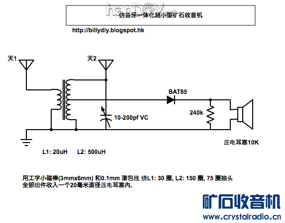 | 本星期的习作是先前说过要做的最小型的矿机. 看看可否把所有组件放进一个20毫米直径的压电蜂嗚器內, 只引出天地线便可收听.