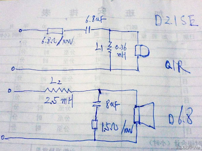 分频器我就会完全按照原厂的电路来搞。下面先把从原装箱里测得的分频电路图与大家分享。