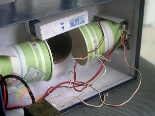 因为之前试过多种箱体结构都不得已放弃,那些结构在这个箱体中低频根本无法很好的改善,有的甚至火上浇油。而加之刚才又增加了一个单元,箱体的内部又成为了一个新的蛀波集散地。于是首先想到的是能够继续做成后导向,通过密封纸板来引导单元背后的声波达到导相孔而不出现混乱,就找出家中质量比较好的纸杯作为通道。掏空底部,将两个纸杯分别套入单元的"屁股",周围用硬纸板做通道,再次试音。