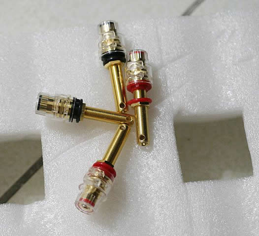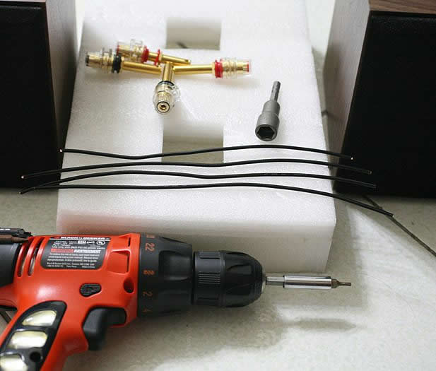 接下來言歸正傳,把今天所要完成的零件拿出來。首先將紙箱打開就可以發現這對喇叭的包裝真的沒話說,上下各有一個特製(開模)的珍珠泡棉,箱子本體也是一個箱體就用一個包裝袋來包裝,哇~從外觀看起來真是物超所值!好了廢話不多說,首先準備組裝所需要的工具,因為工欲善其事必先利其器(不過大部分都是跟朋友借來的只有烙鐵是自己購買的),接下來拿出套件所附的2mm單芯線,喇叭端子,固定單體的半圓頭螺絲,排列整齊以利後續的裝配工作。