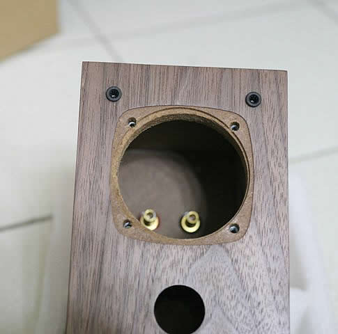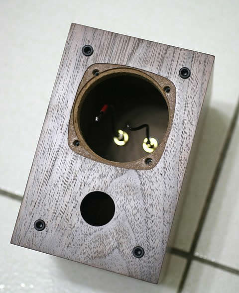 接下來將喇叭端子的螺絲(固定線材)拆下來因為線材太粗了無法將線放在喇叭端子焊接的部份所以將螺絲拆下來,然後再將他裝到木箱上,不過不好鎖因為洞口實在太小,小弟的手又太大,搞了半天只好藉助特殊工具—長型套筒工具,喇叭端子總算鎖好了現在要開始焊接2mm的單芯線,這個時候利用烙鐵的高溫特性,先將喇叭端子的部份加熱並且上錫,再將算好長度的線焊上去,哇~這線材可真是又硬又粗啊!真不好焊接,好險我朋友告訴我要用他介紹我的烙鐵(按一個黃色按鍵就很快提昇溫度),果然很快的就焊上去了,接著下來是將線材的正/負極區分出來接著組裝單體囉~~(快了!!總算完成一半了~),這個單體看起來小小的跟電腦喇叭的大小差不多,就是不知道聲音差異多少?