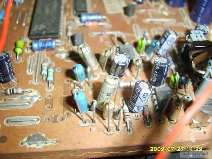 3,板子上的卧式电容换了同样容量的飞利浦卧式电容。原因是,那些电容大多数都时间很长了,容量已经有了偏差,还有点,我机子板子上有个卧式电容竟然漏油了,旁边白白的东东。有几个容量比较特别的,例如1UF,2.2UF,飞利浦卧式,立式的电容都没有这个容量,只有考虑换其他品牌的了,选择了日本原产的化工。