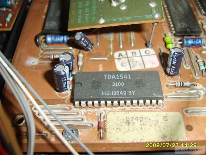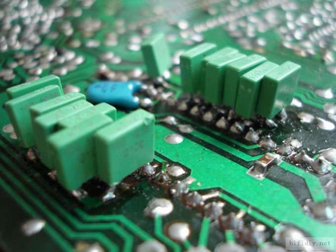 2,另外的一个地方是TDA1541电容,原本是贴片电容,自己手上有还有两台TDA1541,对比着听,声音怎么就是那么闷,朦胧,不通透。焊接的时候确实要细心点,个子矮,PCB都是老板子了,很容易连铜箔都跑出来了。选择了绿色的ERO 0.1. 考虑过0.1的MKP,但是个子都大了些,暂时用绿色ERO吧。