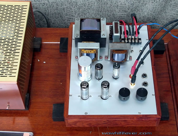 耳機所需的電功率 wat t ,大大低於喇叭,半瓦 0.5 w 已令人震耳欲聾,實質上耳機是一對不折不扣的小型全音喇叭,是最接近耳朵的貼身享受,所要求的放大器必須聲音幼細和頻寬響應闊、失真低、音色靚當然很重要,重新設計一台有輸出牛的小型單端後級就最恰當了,亦同時儘量照顧到市面大多數耳機的阻抗通常由 30 多歐至 600 歐 ---- 種類繁 多, 靜電耳機則除外。線路應簡而精,用料則精而準,製作成本有限,是輕便的巧手製作。還記得與友人談及耳機放大,他靈機一觸,加一點要求,既然是小功率後級,附設可接駁喇叭的輸出接線座,用途和玩味更廣了。 圖 (1) 在約 9 吋× 12 吋細小的花梨木機箱擺設上電源牛、輸出牛、扼流圈、濾波電容、整流管、穩壓管、放大管、音量控制器、輸入和輸出接線座,就明白得到 ECL82/6BM8 這複合管三極加五極的好處了,三極負責訊號放大,五極就是 2w 單端的功率放大,直接推動輸出牛,不少細功率小型擴音機也樂於採用 ECL8 2 ,而且這是好聲的 Hi Fi 管,古董膽品種選擇很多:英國、美國、德國也有不少大牌子的產品,可算是價廉物美。 輸出變壓器: 市面上並沒有大張旗鼓的售賣耳機輸出變壓器 ( 牛 ) ,其實祇要是高質素 2W 或 4W 的單端輸出牛已合條件,最好有 8 Ω、 16 Ω或 32 Ω更為合適,首先環顧的古董產物,繼而調節了焦點就是德國古董牛,取其聲音中性、通透;越早期的變壓器是未經絕緣漆洗禮的,優點: 1/ 是聲音更自然、從容、空氣感強。 2/ 是容易解剖與改造。德國人對於切割和裝堪技術非常準繩是值得我們讚揚的,不倚賴絕緣漆對矽鋼片和銅線的黏附作用,也可令變壓器靜靜地不發出鐵片震動聲。接近大戰期間的前後 20 年間,三大音響工業國家:美、英、德出品的變壓器大多不使用絕緣漆,後來人們為了使變壓器易於滿足電器測試 --- 這考試關,越多了使用絕緣漆,高壓絕緣測試,鐵片因磁場震動的噪聲 --- 等投訴「鑊氣」就越少。由 50~60 年開始英國和美國的變壓器已很普遍使用絕緣漆,德國是最後的「死硬派」堅持者,到 80 年已全面放下堅持,跟大路走了。
