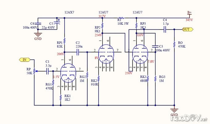 好久不来论坛了,倒不是没乐趣,首要是顿时大四就结业了,各类参差不齐的工作忙不外来,抽闲给伴侣做了一台基于和田茂线路构架的电子管耳放,线路图(图上各点电压值均为实测)如下,稍晚上传变动后的PCB国界,压缩包内是PDF名目标电路图