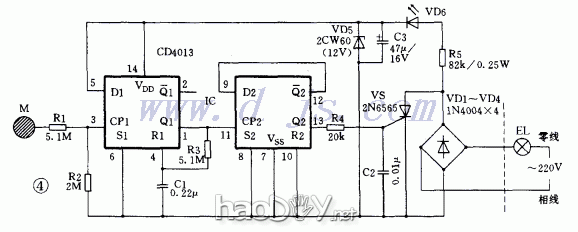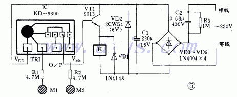 图4是用双D触发器建造的触摸开关。CD4013是双D触发器,别离接成一个单稳态电路和一个双稳态电路。单稳态电路的浸染是对触摸信号举办脉冲展宽整形,担保每次触摸举措都靠得住。双稳态电路用来驱动晶闸管VS。当人手摸一下M,人体走漏的交换电在电阻R2上的压降,其正半周信号进入③脚CP1端,使单稳态电路翻转进入暂态.其输出端Q1即①脚跳变为高电平,此高电平经R3向C1充电,使④ 电位上升,当上升到复位电平常,单稳态电路复位,①脚规复低电平。以是每触摸一次M,①脚就输出一个牢靠宽度的正脉冲。此正脉冲将直接加到11脚CP2端,使双稳态电路翻转一次,其输出端Q2即13脚电平就改变一次。当13脚为高电平常.VS开通,电灯EL点亮。这时电容C3两头的电压会跌落到3V阁下,发光管VD6熄灭,因为CMOS电路的微功耗特点,以是集成块仍能正常事变。当13脚输出低电平常。VS失去触发电流,当交换电过零时即关断,EL熄灭。这时C3两头电压又规复到VD5的稳压值12V,VD6发光用来指示开关的位置。由此可见,每触摸一次M,就能实现电灯“开” 或“关”,它对外也仅两根引出线,故安装与行使都异常利便。 图5是一个回收一音乐门铃芯片KD-9300建造而成的触摸开关,电路新奇风趣。它奇妙地操作门铃芯片内部电路的成果,借助人体的泄泄电流去节制芯片内部的双稳态触发器。我们知道音乐集成电路具有极高的输入阻抗,当人手触碰“开”电极片M1时,人体的泄泄电流由R1注人音乐门铃芯片的触发端TR1,使芯片内部双稳态触发器翻转,以使整个门铃芯片泛起低电阻,三极管VT1导通,继电器K吸合,常开接点可接通被控电器。必要封锁电器时,只要触摸一下“关” 电极片M2,人体泄泄电流经R2注人芯片的Vss端,迫使集成块内部的双稳态触发器再次翻转,使整个芯片是现高电阻,VT进人截至态,K失电开释,被控电器断电。