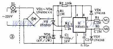 图3是一个电源电路采纳非凡计划的用555时基电路建造而成的触摸开关,它对外仅两根引出线,因此可直接代替平凡开关而不必变动电源布线。EL是不大于25W的白炽灯或交换打仗器。虚线左部为平凡照明线路,右部为触摸开关电路。IC处于复位状态时,③脚输出低电平,晶闸管VS的门极通过电阻R3被钳位在低电平,故VS关断,EL不亮,此时555的事变电源由220V交换电经灯EL、二极管VD1~VD4整流、电阻R2限流、VD5稳压与IC1滤波得到约6V直流事变电压供电。当 555时基电路②脚受触发处于置位时,IC③脚输出高电平,VS开通,EL点亮发光。VS开通后,555事变电源直接由灯EL、二极管VD1~VD4、晶闸管VS与稳压管VD5组成回路,C1两头仍能得到6V直流事变电压,只是此时电阻R2不起浸染。