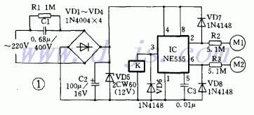 图1和图2是回收555时基电路建造的双键触摸开关与单键触摸耽误开关。图1中M1是“开”触摸片,当人手触碰时,人体感到的杂波信号加到时基电路的低电平触发端IC的②脚,电路置位,③脚输出高电平,继电器K得电吸合,其常开触点闭合,被控电器通电事变。M2为“关”触摸片,一旦触碰,人体感到的杂波信号加到555的阈值端IC⑥,电路复位,③脚输出低电平,继电器失电跳闸,被控电器遏制事变。
