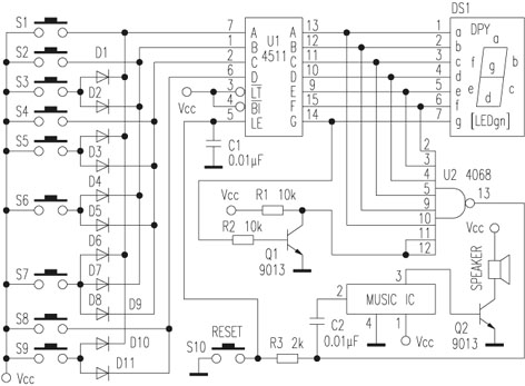 S1~S9为9个抢答按键,CD40鼙是BCD码7段译码器,CD4068是八输入与非门,VD1~VD11起对轻触按键举办BCD编码的浸染。初始状态下,CD40鼙驱动LED数码管表现0,即A、B、C、D、E、F这六个笔画为1,G笔画为0。现将G笔画信号用三极管反相,把0对应的笔画信号变为满是1,然后将这些笔画信号送给八输入与非门CD4068。按照与非门的逻辑相关可知CD4068输出为0,这样7段译码器CD40鼙就处在了译码状态。由于除0外的其他数字对应的笔画信号不全为1,不能使CD4068输出1,也不能使7段译码器CD40鼙处于译码状态。以是当有按键按下时,CD4068就输出锁存信号0,致使7段译码器CD40鼙把所键入的数字锁存表现。这样后按下的键就不起浸染了。数码管上就只表现最先按下的键号。起到了抢答的浸染。 |