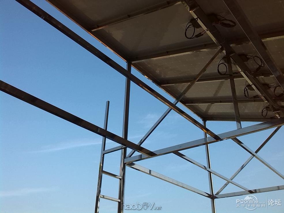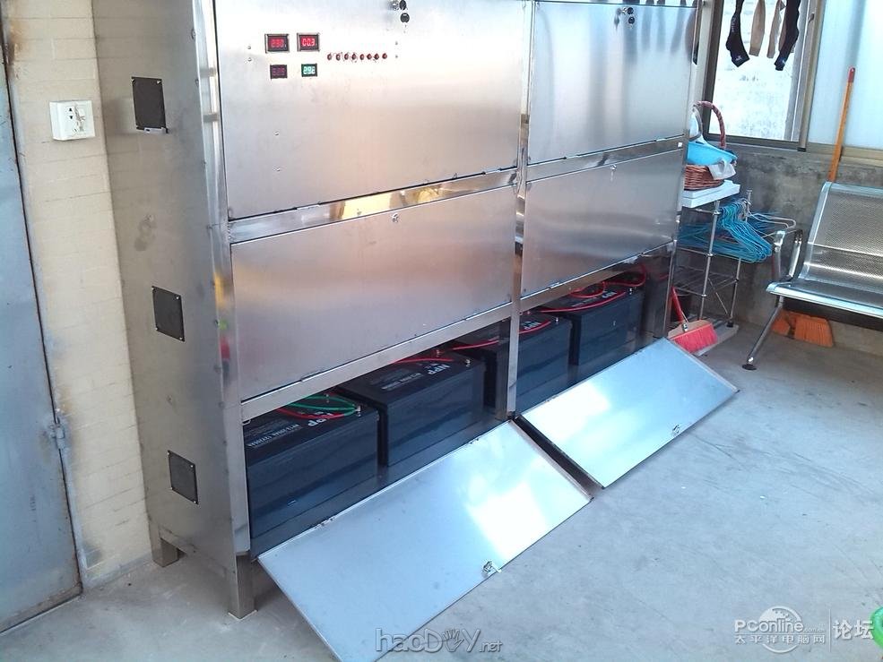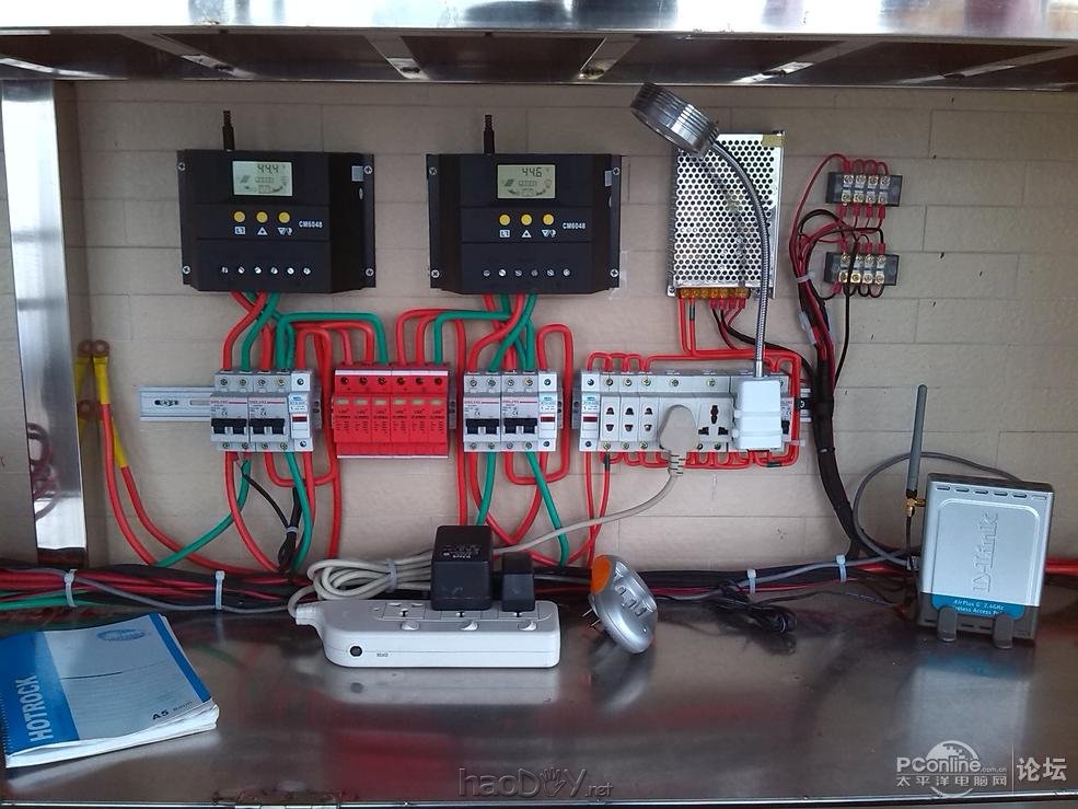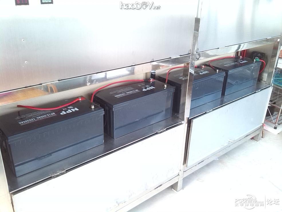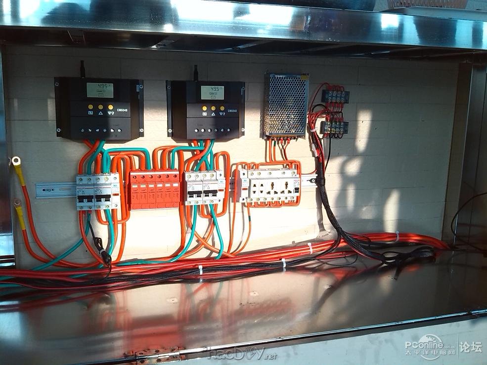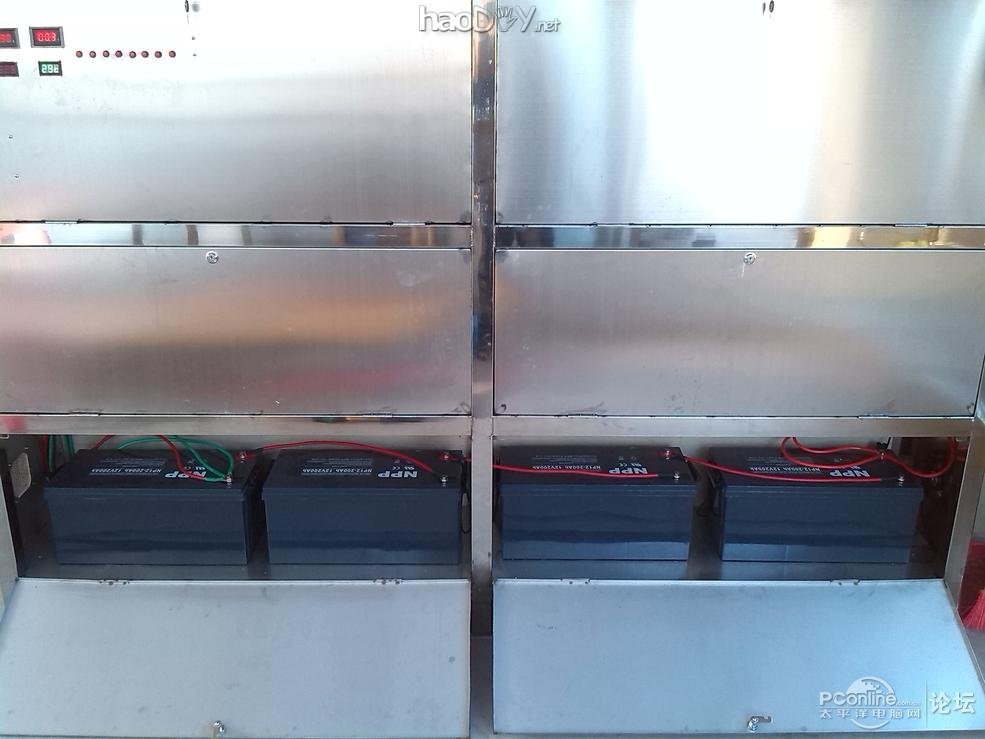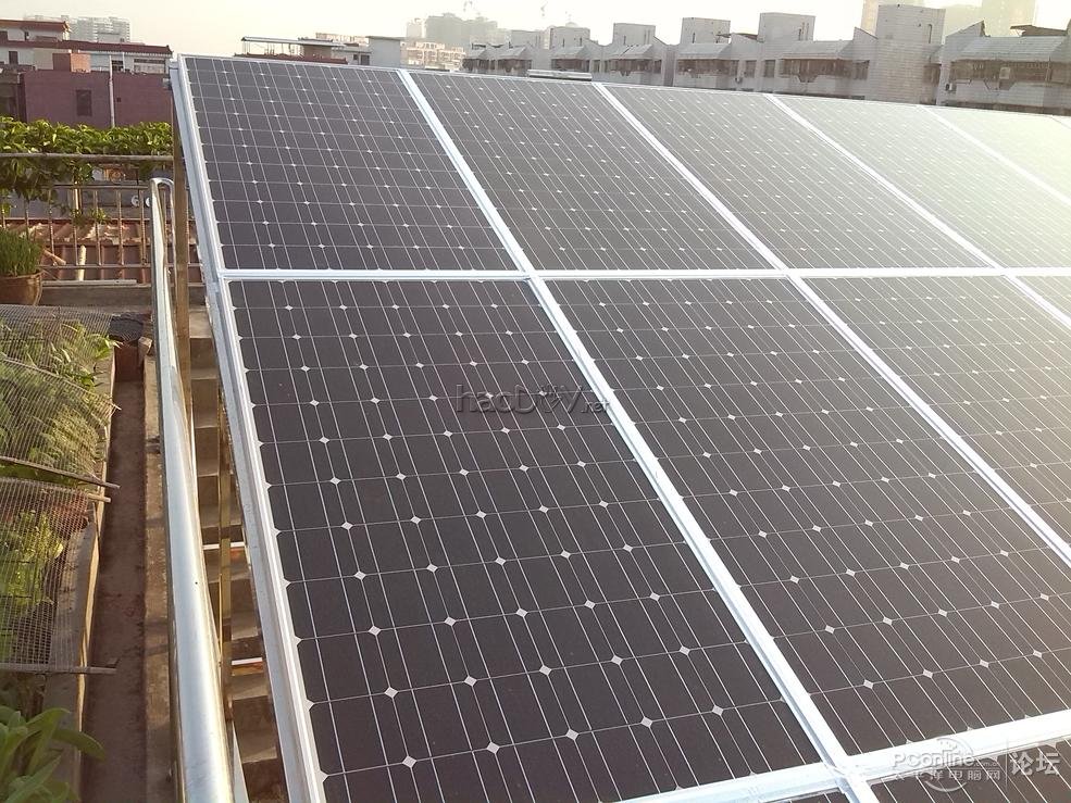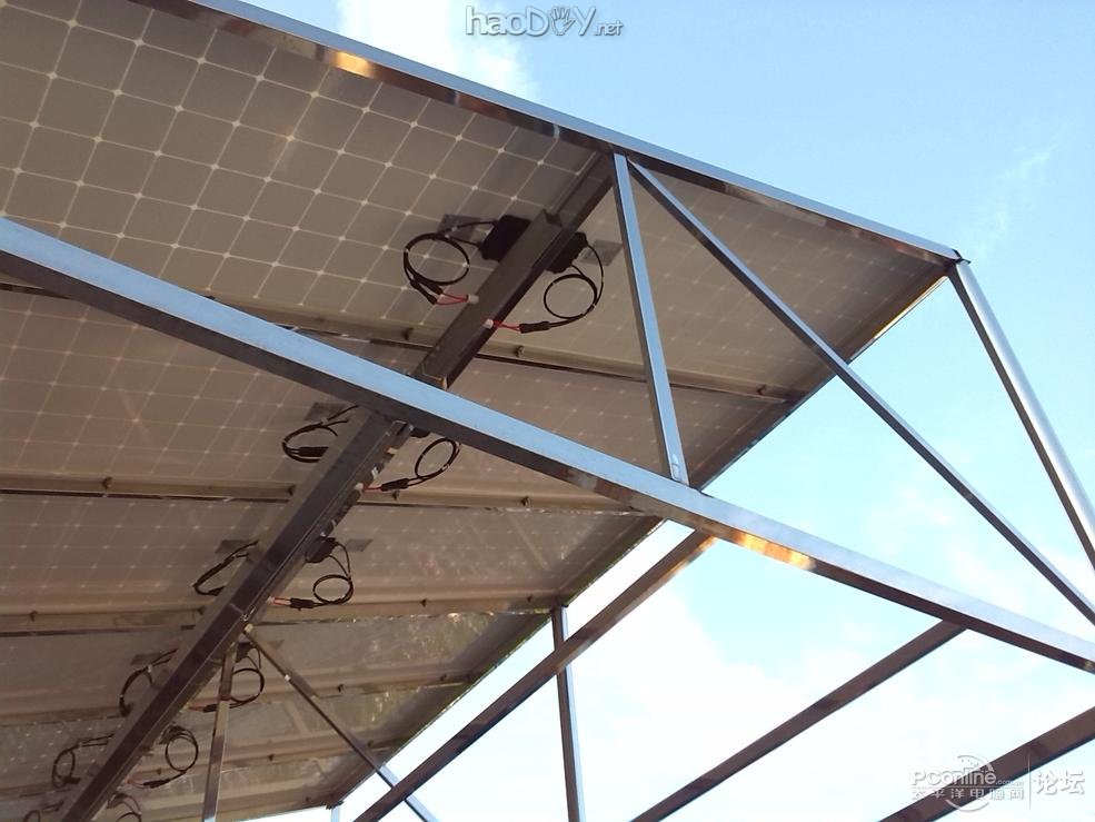 图 经过了天兔台风的肆掠,体会到台风的威力;跟制作太阳能板支架的师傅强调要用好的材料,可以抵御12级台风的级别才行,所以不锈钢材都是用加厚的需要订货才行。 ![]() 整体图,一共是18块200W的单晶硅太阳能电池板,每个板子可以独立拆卸,方便以后维护。 ![]() 安装之前需要先试好每块板子的螺丝位是否正确,螺丝也是不锈钢的,一劳永逸,不用考虑生锈问题。 ![]() 做好的支架整体图,待会需要四个人才可以抬起来,非常重 ![]() 不锈钢支柱底座,也是不锈钢的,开孔非常困难,一共六条支柱。 ![]() 这个是机柜,一共三层,最上面一层放置逆变主机和太阳能控制器,断路器等开关设备,第二、三层是电池位置,可以放置8个12V 200AH电池 ![]() 12V 200AH太阳能专用深循环电池,非常重,搬到6楼,手都快断了 ![]() ![]() 预留好开孔位,需要考虑仪表,布线,开关按钮,风扇等 ![]() 完工效果图 ![]() ![]() ![]() ![]() ![]() 机柜上有输出交流电压,输出交流电流,蓄电池电压,机柜温度,以及对应的按钮,风扇开关,室外LED光管开关等,还有两个预留开关。 ![]() 18块太阳能电池板分为两组,一组2串4并,另外一组2串5并,分别接60A太阳能控制器;以下这个是自己DIY的汇接箱,可以实时直观的看到目前太阳能发电情况,红色的是电压,蓝色的是电流,红色电压在带负载的情况下可以达到55左右,空载的时候最高可以达到90左右(11月日照)蓝色电流最高的一组可以达到23A左右(10块板子) ![]() ![]() ![]() ![]() 机柜内部情况,黑色的是6000W逆变主机(直流主供型,可以充分利用太阳能发电,蓄电池没有电的情况下会直接切换到市电,待蓄电池充满又自动切换回逆变供电,切换时候不会有任何感觉,无缝切换),蓝色那个是双电源自动切换开关,如果关闭逆变主机则会自动切换到市电,这个切换是有时延的,大概1秒左右,断电有感觉。其它的就是断路器和漏电保护开关。 #p#分页标题#e#![]() ![]() ![]() 2个60A的太阳能控制器,具有很详尽的实时数据查看功能,可以了解当前电池电量,温度,充电电流,电池电压,发电安时数,用电安时数非常好用。有个8A的开关电源,主要用来提供仪表,机箱风扇,室外LED光管12V直流供电用。几个两相和三相插座是测试用。 ![]() ![]() 每一层都有一个散热风扇,目前温度可以控制在30度以内 ![]() ![]() 双电源切换开关 ![]() ![]() ![]() ![]() ![]() ![]() ![]() ![]() 全景图,中间太阳能电池板之间的接缝考虑到漏水问题,使用了铝箔纤维胶布,可以防晒,防水,而且不容易撕烂,粘性很强。 ![]() ![]() 最下面有水槽,雨天接水可以用来浇菜淋花。 ![]() 整体结构,比较牢固,应该可以抗击台风。 ![]() ![]() ![]() ![]() ![]() ![]() #p#分页标题#e#![]() ![]() ![]() ![]() ![]() ![]() 每块板子都使用MC4专用接口相连,维护便易,走线使用铁线槽较为耐用,线槽下有四条防水LED光管,晚上非常亮。 ![]() ![]() ![]() ![]() 让师傅做了一个梯子,方便攀爬维护 ![]() 一段时间后太阳能电池板表面会积聚灰尘,从而使发电效率受到影响,需要定期对板子进行清理。以下是太阳能板子的清理利器(洗车用,带水枪) ![]() ![]() 清洁后的板子焕然一新(最好选择太阳快下山的时候清理,这时候板子已经凉下来,而且已经不在发电状态) ![]() 抛砖引玉的两块小板子,太阳能应急灯用,很方便,用它做过太阳能仰角测试 ![]() ![]() ![]() 太阳能热水器,用了几年了,就是从它开始发现太阳能的好处。 ![]() 这是卫星天线,另外一个爱好 ![]() ![]() 避雷器的安装 直流避雷器,每路电池板接一个(最好安装在保险丝和断路器后面),地线接机柜即可(要求是接最近的钢架结构) ![]() ![]() 交流避雷器(图中黄色热缩管包着的就是地线,还没有找师傅焊好接口,只是简单的靠在钢架上)#p#分页标题#e# ![]() ![]() 太阳能直流电表改太阳能电池供电(直流电流表需要至少DC 4V以上电压供电最多28V,所以不能使用48V的太阳能电池供电只能另外搞两块小板子专门供电。使用开关电源供电晚上没有任何电流经过也是浪费,最重要的是两个直流电流表使用一路开关电源供电容易烧毁,必须分两路电流供电才能稳定。) ![]() 太阳能电池板只有巴掌大小 ,很可爱(外形尺寸:130×190×15MM 输出电压/电流:9V、260MA 功率:2W-2.3W) ![]() 专门做了一个不锈钢支架支撑两块小板,DIY夹具固定在扶手上 ![]() ![]() ![]() 安装无线视频监控摄像头以及网络摄像头,实现电视、手持2.4G无线视频接收设备以及电脑、手机远程实时监控太阳能发电情况。 2.4G无线影音传输设备,可以连接电视收看。 ![]() 手持2.4G无线影音接收设备,无需开电视,快捷方便。 ![]() 海康威视C2网络摄像头,支持WIFI,可以实现在电脑手机远程查看。 ![]() 用铝合金材料DIY的摄像头支架 ![]() ![]() 摄像头支架直接固定在机柜上,需要打开柜子的时候可以将支架向后拨。 ![]() ![]() ![]() ![]() 可以在电脑上远程查看发电情况,也可以安装专用软件在手机上看,无需购买网络域名,配置很简单。 ![]() 更换PC级双电源自动切换开关和安装远程遥控断路器 二级遥控断路器(带配电箱)考虑到系统整合和美观最后决定只使用内里配件安装 ![]() 白色的两个是3000米超远距离双键遥控器,实际测试一楼遥控六楼不锈钢机柜内断路器无压力 ![]() PC级双电源自动切换开关,切换时间小于80MS,不会造成日常电器断电(实测LED灯会闪一下,但是电视、洗衣机、冰箱等日常家用电器不会断电)。 #p#分页标题#e#将PC级ATS开关和遥控断路器