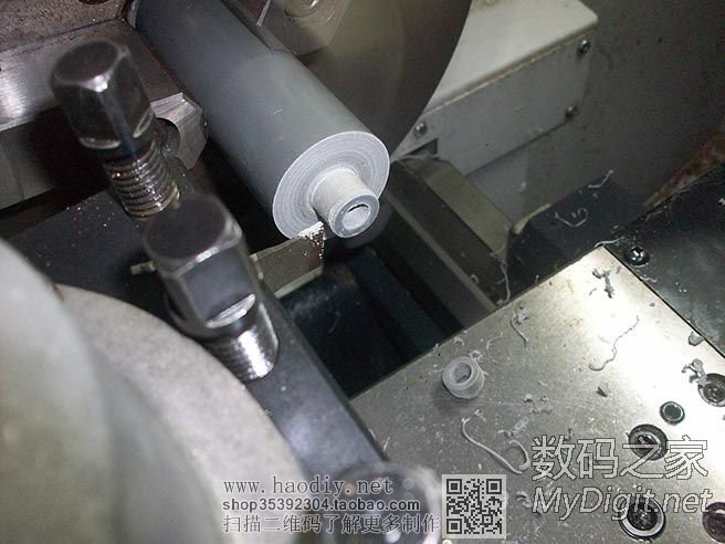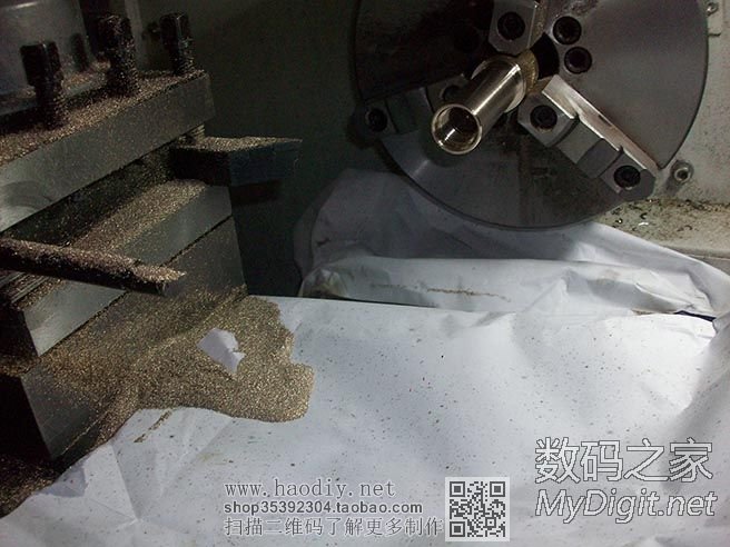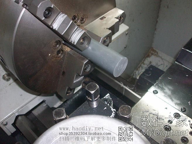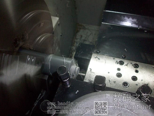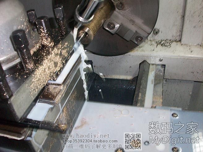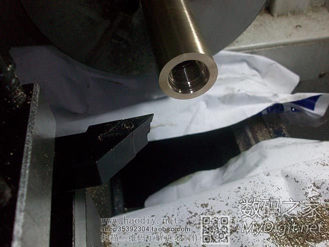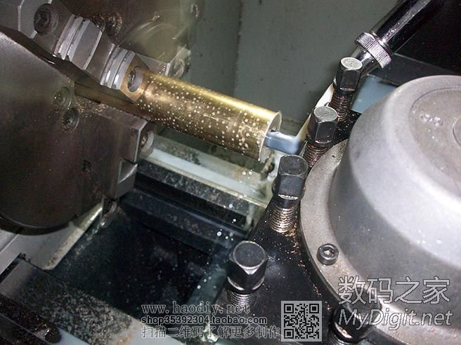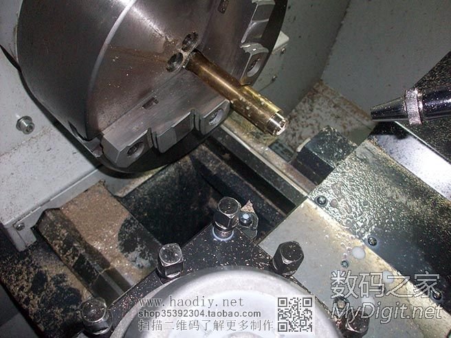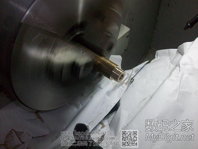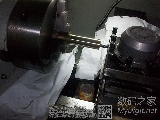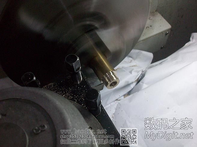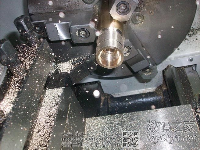 开始车紫铜了,卡盘是在旋转的,因为开了闪光灯,拍出来就是这个效果了