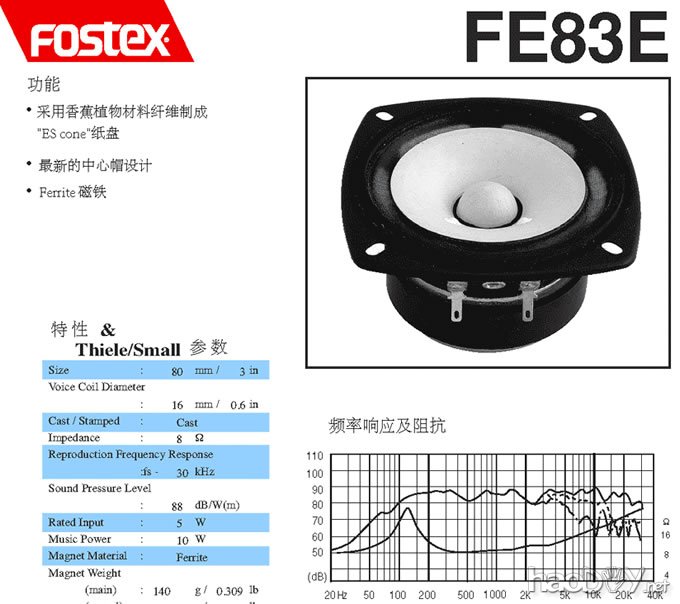 能够在3寸超小口径喇叭单元实现88dB的高灵敏度,这完全是基于Fostex的特有技术---“ES香蕉纤维纸盘”,并能够实现127khz---30khz的良好频宽,中高频的表现超乎想象,高频更已经接近了超高频的水准了。