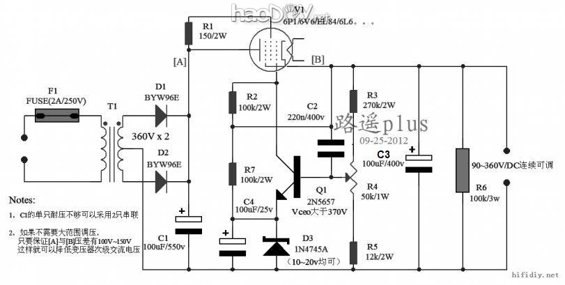 路遥兄设计的胆稳压电源,不少人都在做。我画了个并管的PCB也有不少人去打板子实作了出来。其实作为前级用1条6P1做调整管就够了。 以6P1最大屏耗12w,电源调整压差100v计算,最大可提供120毫安电流,打个折扣,100毫安肯定没什么问题。说实在的并管用在前级上大材小用了。 路遥兄这个电路第三次改版了,害人啊!应坛里兄弟之请,专门按新电路画了个6P1的单管板子。尺寸也缩减为7*10厘米。 除了管座外,其他元件都可两面安装。管子放在了板子正中间,便于外露时美观。 ![]() |