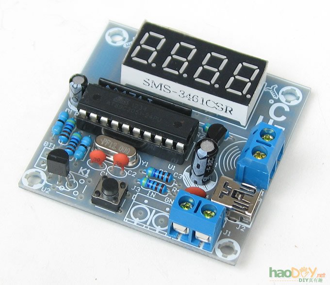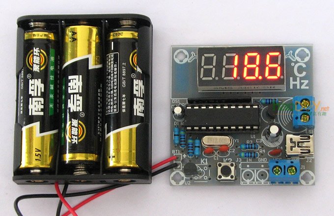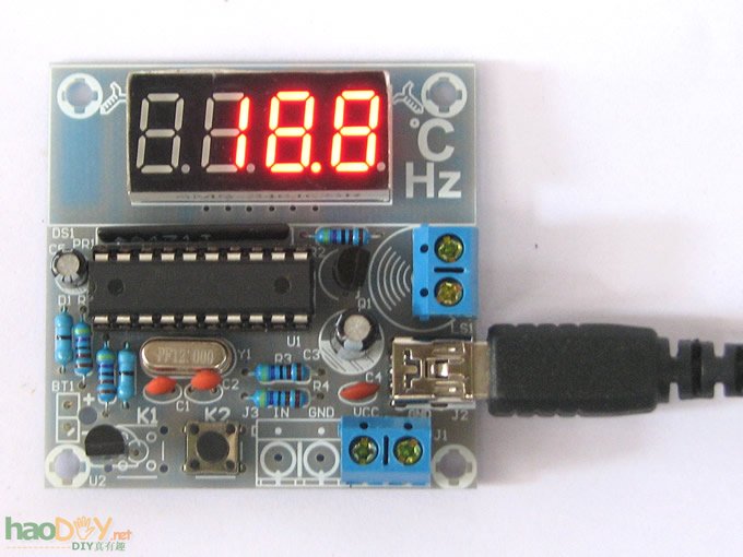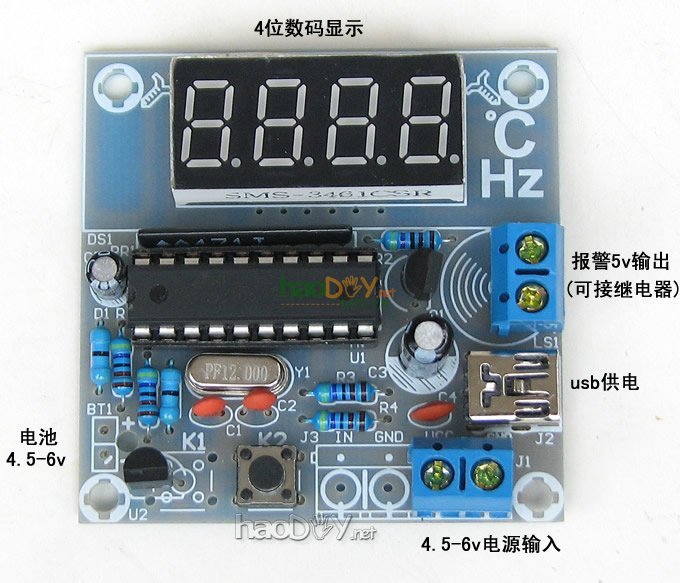 本电路采用用DS18B20(拆机品)做温度传感器,4位共阴数码管做显示,AT89C2051(拆机品)单片机或兼容单片机做处理控制,电路简单,无需调试,焊接无误,即可直接使用。接入5V±0.5V直流电源(注意区分正负极),也可以直接用USB线接入电源电路显示当前的温度值。 电路中还设计了一路超温报警控制输出: 当前温度超出设定温度时输出5V电压的接线柱,可驱动5V继电器等,如需接线柱请告知不然接线柱无法使用 设定温度方法: 实时显示环境温度值,轻触按键K2可以显示设定的温度报警值大约4秒钟,如需调整长按K2按键,设定温度值每秒钟减一度,从开机时设定的温度减到0度,温度设定值回到99度,依次循环。每次的设定值都会自动存储,下次开机不必再重新设置。掉电后也不会丢失,下次上电时,单片机会自动读入上次的温度设定值。 ■注意:温度传感器DS18B20(拆机品)外形和三极管很相似,安装时注意不要装错。 ■供电电压:直流5V 成品