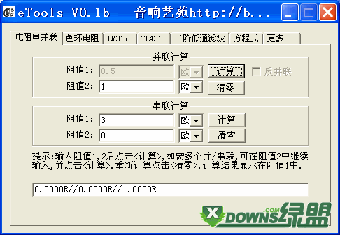 支持功能如下: 1.方程式 支持一元二次,一元一次,二元一次方程求值.支持正负数,小数系数输入 2.电阻串并联 支持电阻串联,并联,反并联计算 3.色环电阻识别 支持市面常见4,5环电阻.支持从阻值反算色环。 4.LM317稳压阻值 支持LM317,LM337,LM350等常见三端稳...