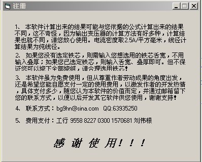 1.本软件计算出来的结果可能与您依据公式计算出来的结果不同,这个不奇怪,因为输出不要去计算有好多种,计算结果也就不同,请您放心使用.电流密度取2.5A/平方毫米,线径计算结果为纯线经 2.如果您没有选定铁芯,则输入您想选用的铁芯舌宽,不用输入叠厚;如果您已经选定铁芯,则输入舌宽,叠厚即可.但不保证您可以绕下全部绕组,请合理选用铁芯! ![]()